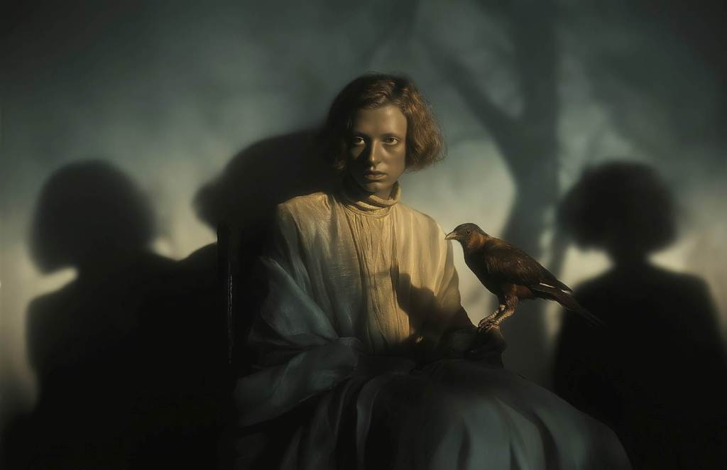 ”Et blik der ikke ser, en fugl der taler uden lyd, en pagt underskrevet i stilhed. Mellem lys og skygge, står sandheden altid skjult”. Prompt og værk af Frank Zlatko Wuich, 2025.